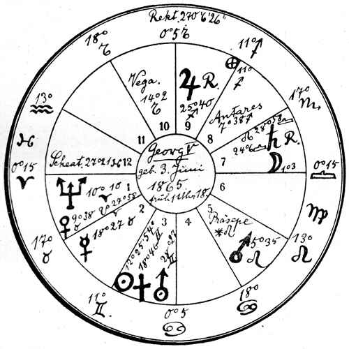 We see that during his birth the Sun was in the 3rd house of the horoscope, which as is well known refers to siblings, relatives, and trips, and that the sensitive point for sickness and death (†) was conjunct the Sun. From this one can at first conclude that the native had to attain honor and ascent through the death of a brother. At the same time the sensitive point for sickness and death in this position—in the 3rd house—should someday bring the native sickness due to travel and danger of death during the same. (See the Astrological Library from Karl Brandler-Pracht, Vol 2, page 154). Concerning this signification, English astrologers have already said that King George V would die a sudden death like his brother, and that his government would face serious disasters on land and sea. The prophecies have already been repeated soon after he took office: